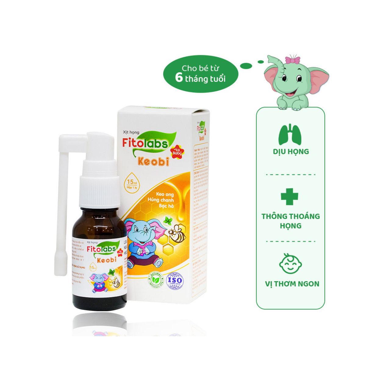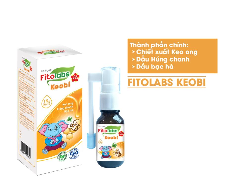 Xịt họng thảo dược Fitolabs Keobi với chiết xuất từ thảo dược quý Keo ong, Húng chanh, Bạc hà... giúp làm sạch, kháng khuẩn họng, ngừa viêm nhiễm, làm dịu họng nhanh và ngăn ngừa các bệnh viêm nhiễm hô hấp trên. Sản phẩm giúp phòng ngừa và hỗ trợ điều trị hiệu quả các bệnh về đường hô hấp.